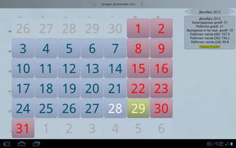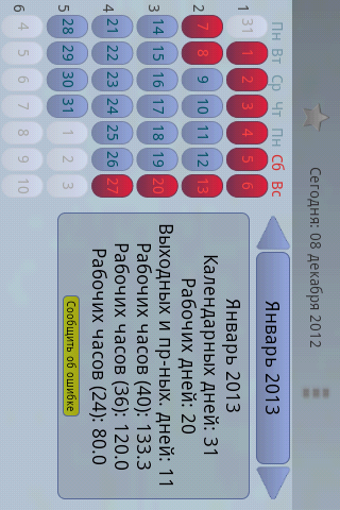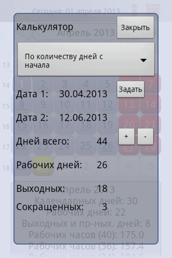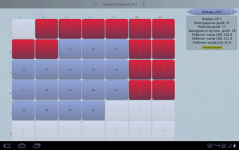 Dessutom erbjuder appen en kalkylator för arbetsdagar som räknar antalet dagar inom ett angivet tidsintervall, inklusive helger och kortare dagar. Den kan anpassas för att passa olika arbetstidsnormer, inklusive 40-, 36- och 24-timmars arbetsveckor. Informationen baseras på den ryska arbetslagstiftningen och tar hänsyn till officiella beslut om flytt av helgdagar.